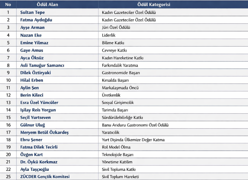 Zirve kapsamında düzenlenen ödül programında, alanında uzman 100 kişilik jüri tarafından değerlendirilen 520 başvuru arasından 25 isim ödül almaya hak kazandı. Kadın girişimciliğinin farklı alanlarda yarattığı etkiyi görünür kılmayı amaçlayan ödüller, toplumsal farkındalık ve ilham açısından dikkat çekti.